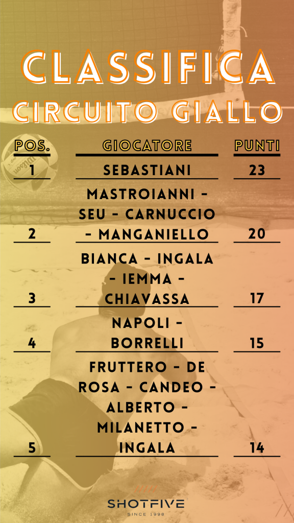 Il Circuito Giallo è dedicato ai giocatori del livello Light. Un percorso leggero e divertente, che mette in palio premi finali per chi totalizza più punti nelle diverse tappe in programma. In palio ci sono i poncho Shotfive (categoria maschile e femminile) e, come premio fedeltà, tutte le ragazze che parteciperanno ad almeno cinque date riceveranno una canotta Monster Block, Sideout o similari. La classifica si chiuderà il 26 aprile, con l’ultima tappa che coinciderà anche con le premiazioni. Naturalmente, come sempre, ogni singola tappa avrà i suoi premi di giornata.